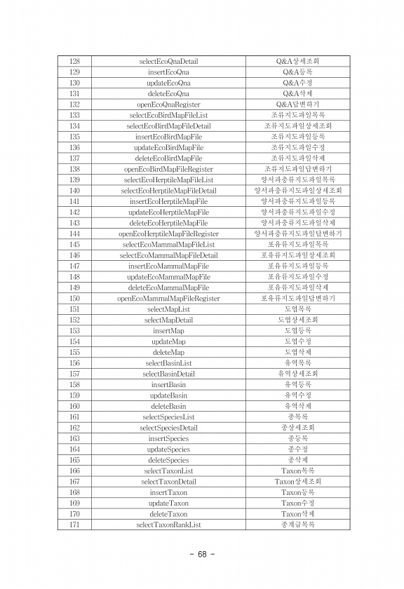 68 128 selectEcoQnaDetail Q&A상세조회 12B insertEcoQna Q&A등록?G updateEcoQna Q&A수정?1 deleteEcoQna Q&A삭제?2 openEcoQnaRegister Q&A답변하기?? selectEcojirdCapWileist 조류지도파일목록?. selectEcojirdCapWileDetail 조류지도파일상세조회?2 insertEcojirdCapWile 조류지도파일등록?7 updateEcojirdCapWile 조류지도파일수정?9 deleteEcojirdCapWile 조류지도파일삭제?8 openEcojirdCapWileRegister 조류지도파일답변하기?B selectEco갻rptileCapWileist 양서파충류지도파일목록 1.G selectEco갻rptile...