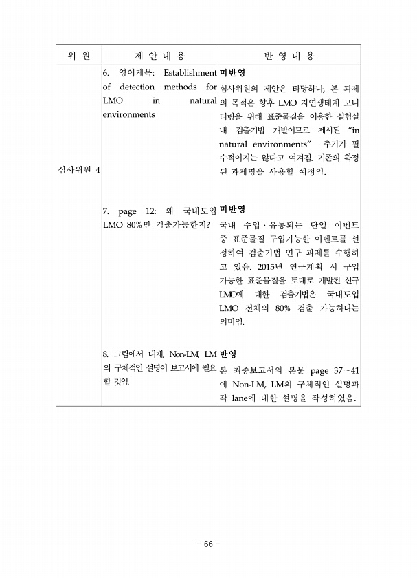 위 원 제 안 내 용 반 영 내 용 심사위원 4 6. 영어제목Establishment of detection methods for LMO in natural environments 7. page 12왜 국내도입 LMO 80%만 검출가능한지? 8. 그림에서 내재, Non-LM, LM 의 구체적인 설명이 보고서에 필요 할 것임. 미반영 심사위원의 제안은 타당하나, 본 과제 의 목적은 향후 LMO 자연생태계 모니 터링을 위해 표준물질을 이용한 실험실 내 검출기법 개발이므로 제시된 “in natural environments” 추가가 필 수적이지는 않다고 여겨짐. 기존의 확정 된 과제명을 사용할 예정임. 미반영 국내 수입?유통되는 단일 이벤트 중 표준물질 구입가능한 이벤트를 선 정하여 검출기법 연구 과제를 수행하 ...