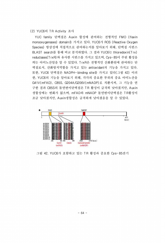64 2 YUC6의 T R Activity 조사 YUC family 단백질은 Auxin 합성에 관여하는 전형적인 FMO flavin monooxygenases domain을 가지고 있다. YUC6가 ROS Reactive Oxygen Species 항상성에 직접적으로 관여하는지를 알아보기 위해, 단백질 시퀀스 BLAST search를 통해 비교 분석하였다. 그 결과 YUC6는 thioredoxin T rx reductases TrxR 와 유사한 시퀀스를 가지고 있으며, Cys- 85이 주된 활성을 띄는 아미노산임을 알 수 있었다. T rxR은 전형적인 산화환원에 관여하는 단 백질로서, 산화방지역할을 가지고 있는 antioxidant의 기능을 가지고 있다. 또한, YUC6 단백질은 NADPH- binding ...