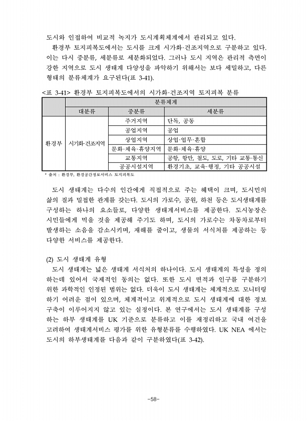 -58- 도시와 인접하여 비교적 녹지가 도시계획체계에서 관리되고 있다 환경부 토지피복도에서는 도시를 크게 시가화 건조지역으로 구분하고 있다 이는 다시 중분류 세분류로 세분화되었다 그러나 도시 지역은 관리적 측면이 강한 지역으로 도시 생태계 다양성을 파악하기 위해서는 보다 세밀하고 다른 형태의 분류체계가 요구된다 표 분류체계 대분류 중분류 세분류 환경부 시기화 건조지역 주거지역 단독 공동 공업지역 공업 상업지역 상업 업무 혼합 문화 체육 휴양지역 문화 체육 휴양 교통지역 공항 항만 철도 도로 기타 교통 통신 공공시설지역 환경기초 교육 행정 기타 공공시설 출처 환경부 환경공간정보서비스 토지피복도 표 환경부 토지피복도에서의 시가화 건조지역 토지피복 분류 도시 생태계는 다수의 인간에게 직접적으로 주는 혜택이 크며 ...