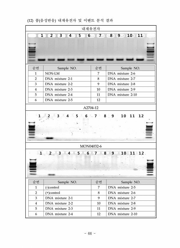 내재유전자 순번 Sample NO. 순번 Sample NO. 1 NON-LM 7 DNA mixture 2-6 2 DNA mixture 2-1 8 DNA mixture 2-7 3 DNA mixture 2-2 9 DNA mixture 2-8 4 DNA mixture 2-3 10 DNA mixture 2-9 5 DNA mixture 2-4 11 DNA mixture 2-10 6 DNA mixture 2-5 12 A2704-12 MON04032-6 순번 Sample NO. 순번 Sample NO. 1 control 7 DNA mixture 2-5 2 + control 8 DNA mixture 2-6 3 DNA mixture 2-1 9 DNA mixture 2-7 4 DNA mixture 2-2 10 DNA mixt...