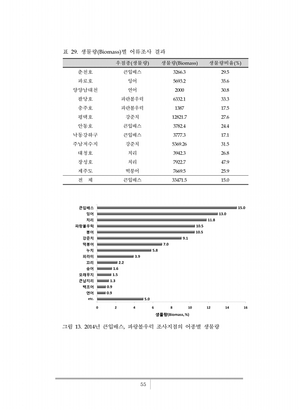 55 우점종 생물량 생물량 Biomass 생물량비율 % 춘천호 큰입배스 3266.3 29.5 파로호 잉어 5693.2 35.6 양양남대천 연어 2000 30.8 팔당호 파란볼우럭 6332.1 33.3 충주호 파란볼우럭 1387 17.5 평택호 강준치 12821.7 27.6 안동호 큰입배스 3782.4 24.4 낙동강하구 큰입배스 3777.3 17.1 주남저수지 강준치 5369.26 31.5 대청호 치리 3942.3 26.8 장성호 치리 7922.7 47.9 제주도 떡붕어 7669.5 25.9 전 체 큰입배스 33471.5 15.0 표 29. 생물량 Biomass 별 어류조사 결과 그림 13. 2014년 큰입배스, 파랑볼우럭 조사지점의 어종별생물량