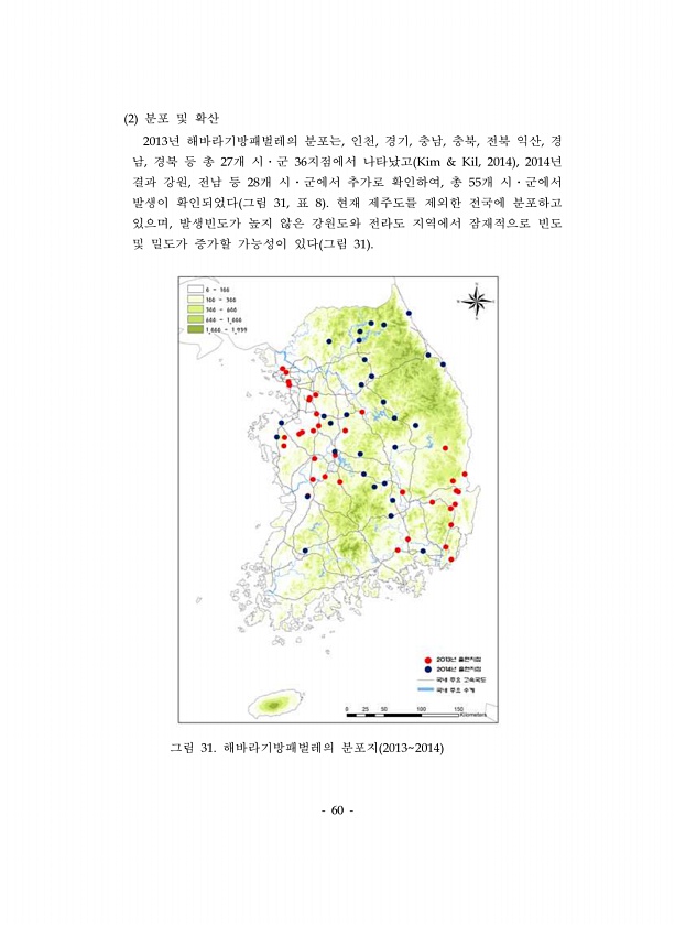 60 2 분포 및 확산 2013년 해바라기방패벌레의 분포는, 인천, 경기, 충남, 충북, 전북 익산, 경 남, 경북 등 총 27개 시?군 36지점에서 나타났고 Kim & Kil, 2014 , 2014년 결과 강원, 전남 등 28개 시?군에서 추가로 확인하여, 총 55개 시?군에서 발생이 확인되었다 그림 31, 표 8 현재 제주도를 제외한 전국에 분포하고 있으며, 발생빈도가 높지 않은 강원도와 전라도 지역에서 잠재적으로 빈도 및 밀도가 증가할 가능성이 있다 그림 31 그림 31. 해바라기방패벌레의 분포지 20132014