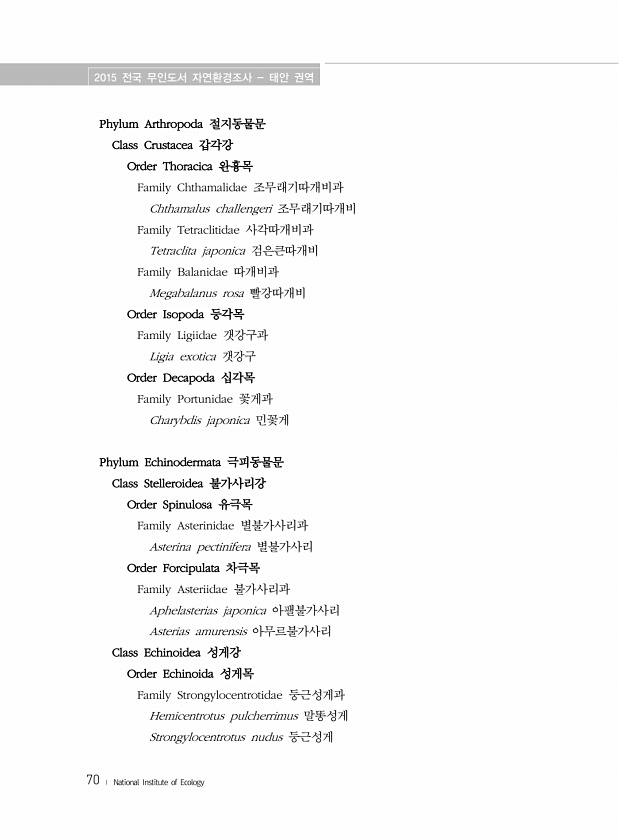 2015 전국 무인도서 자연환경조사 태안 권역 70 ? National Institute of Ecology Phylum Arthropoda 절지동물문 Class Crustacea 갑각강 Order Thoracica 완흉목 Family Chthamalidae 조무래기따개비과 Chthamalus challengeri 조무래기따개비 Family Tetraclitidae 사각따개비과 Tetraclita japonica 검은큰따개비 Family Balanidae 따개비과 Megabalanus rosa 빨강따개비 Order Isopoda 등각목 Family Ligiidae 갯강구과 Ligia exotica 갯강구 Order Decapoda 십각목 Family Portunidae 꽃게과 Charybdis japonic...
