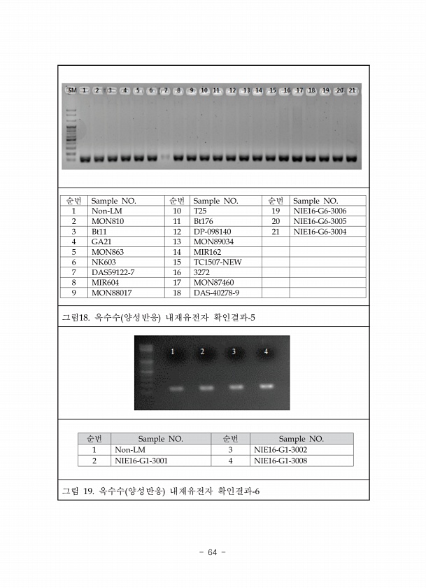 순번 Sample NO. 순번 Sample NO. 순번 Sample NO. 1 Non-LM 10 T25 19 NIE16-G6-3006 2 MON810 11 Bt176 20 NIE16-G6-3005 3 Bt11 12 DP-098140 21 NIE16-G6-3004 4 GA21 13 MON89034 5 MON863 14 MIR162 6 NK603 15 TC1507-NEW 7 DAS59122-7 16 3272 8 MIR604 17 MON87460 9 MON88017 18 DAS-40278-9 그림18. 옥수수 양성반응 내재유전자 확인결과-5 순번 Sample NO. 순번 Sample NO. 1 Non-LM 3 NIE16-G1-3002 2 NIE16-G1-3001 4 NIE16-G1-3008 그림 19. 옥수수 양...