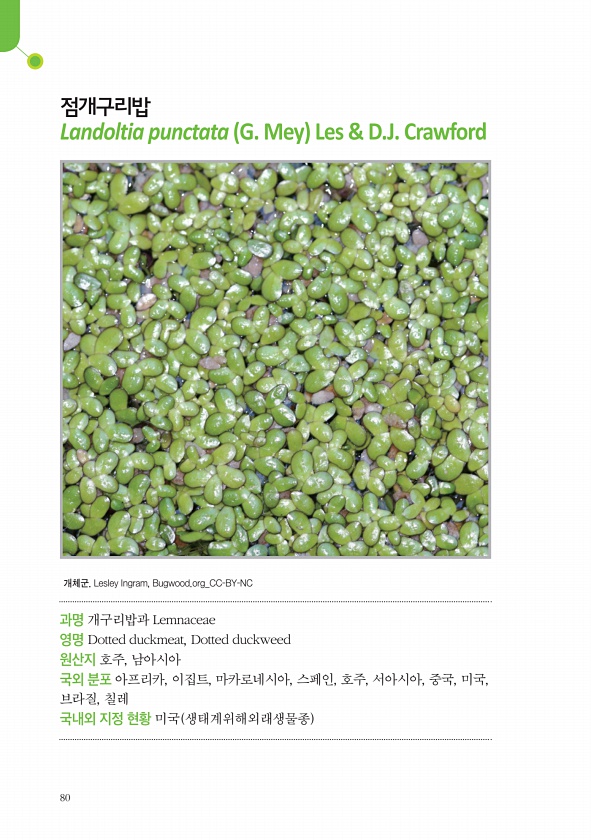 80 점개구리밥 Landoltia punctata G. Mey Les & D.J. Crawford 과명 개구리밥과 Lemnaceae 영명 Dotted duckmeat, Dotted duckweed 원산지 호주, 남아시아 국외 분포 아프리카, 이집트, 마카로네시아, 스페인, 호주, 서아시아, 중국, 미국, 브라질, 칠레 국내외 지정 현황 미국 생태계위해외래생물종 개체군. Lesley Ingram,Bugwood.org_CC-BY-NC