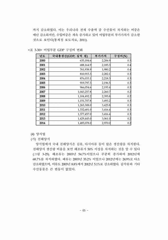 65 까지 감소하였다. 이는 우리나라 전체 수출액 중 수산물이 차지하는 비중은 매년 감소하지만, 수입비중은 계속 증가하고 있어 어업부분의 부가가치가 감소한 것으로 보인다 통계청 보도자료, 2011 표 3-30 어업부분 GDP 구성비 변화 년도 국내총생산 GDP; 십억 원 부가가치 구성비 % 2000 635,184.6 2,206.9 0.3 2001 688,164.9 2,185.3 0.4 2002 761,938.9 1,980.2 0.4 2003 810,915.3 2,282.1 0.3 2004 876,033.1 2,218.3 0.3 2005 919,797.3 2,196.5 0.3 2006 966,054.6 2,193.4 0.3 2007 1,043,257.8 2,260.7 0.2 2008 1,104,492.2 2,...