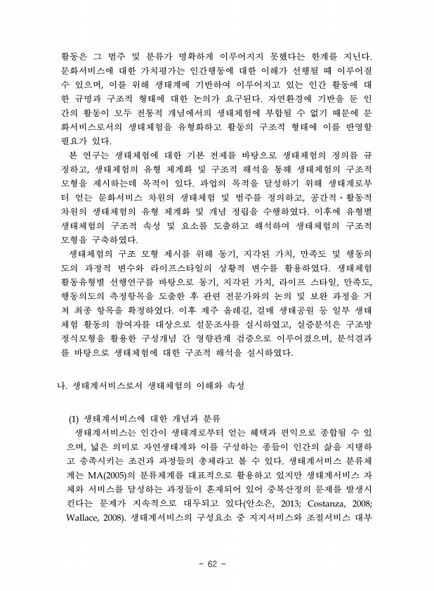 62 활동은 그 범주 및 분류가 명확하게 이루어지지 못했다는 한계를 지닌다 문화서비스에 대한 가치평가는 인간행동에 대한 이해가 선행될 때 이루어질 수 있으며 이를 위해 생태계에 기반하여 이루어지고 있는 인간 활동에 대 한 규명과 구조적 형태에 대한 논의가 요구된다 자연환경에 기반을 둔 인 간의 활동이 모두 전통적 개념에서의 생태체험에 부합될 수 없기 때문에 문 화서비스로서의 생태체험을 유형화하고 활동의 구조적 형태에 이를 반영할 필요가 있다 본 연구는 생태체험에 대한 기본 전제를 바탕으로 생태체험의 정의를 규 정하고 생태체험의 유형 체계화 및 구조적 해석을 통해 생태체험의 구조적 모형을 제시하는데 목적이 있다 과업의 목적을 달성하기 위해 생태계로부 터 얻는 문화서비스 차원의 생태체험 및 범주를 정의하고 공간...