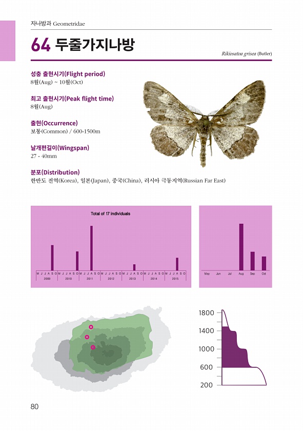 80 자나방과 Geometridae 성충 출현시기 Flight period 8월 Aug 10월 Oct 최고 출현시기 Peak fight time 8월 Aug 출현 Occurrence 보통 Common 600-1500m 날개편길이 Wingspan 27 40mm 분포 Distribution 한반도 전역 Korea , 일본 Japan , 중국 China , 러시아 극동지역 Russian Far East Rikiosatoa grisea Butler M J J A S O M J J A S O M J J A S O M J J A S O M J J A S O M J J A S O M J J A S O May Jun Jul Aug Sep Oct 2009 2010 2011 2012 2013 2014 2015 Total of...