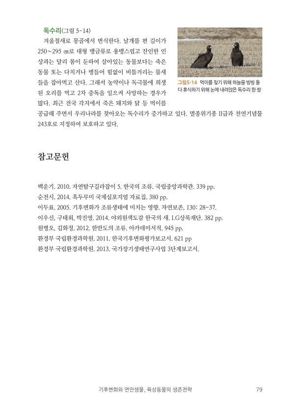 기후변화와 연안생물, 육상동물의 생존전략 79 독수리 그림 5-14 겨울철새로 몽골에서 번식한다. 날개를 편 길이가 250∼295 ㎝로 대형 맹금류로 용맹스럽고 잔인한 인 상과는 달리 몸이 둔하여 살아있는 동물보다는 죽은 동물 또는 다치거나 병들어 힘없이 비틀거리는 물새 들을 잡아먹고 산다. 그래서 농약이나 독극물에 희생 된 오리를 먹고 2차 중독을 일으켜 사망하는 경우가 많다. 최근 전국 각지에서 죽은 돼지와 닭 등 먹이를 공급해 주면서 우리나라를 찾아오는 독수리가 증가하고 있다. 멸종위기종 II급과 천연기념물 243호로 지정하여 보호하고 있다. 참고문헌 백운기. 2010. 자연탐구길라잡이 5. 한국의 조류. 국립중앙과학관. 339 pp. 순천시. 2014. 흑두루미 국제심포지엄 자료집. 380 pp. 이...