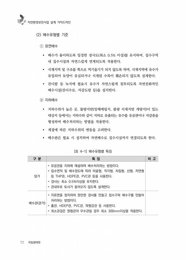 72 국립생태원 자연환경보전사업 설계 가이드라인 2 배수유형별 기준 ① 표면배수 배수가 용이하도록 일정한 경사도 최소 0.5% 이상 를 유지하며, 집수구역 내 집수시설과 자연스럽게 연계되도록 적용한다. 식재지역 및 구조물 쪽으로 역기울기가 되지 않도록 하며, 식재지역에 유수가 유입되어 토양이 유실되거나 식재된 수목이 훼손되지 않도록 설계한다. 잔디밭 등 녹지에 필요시 유수가 자연스럽게 침투되도록 자연친화적인 배수시설 잔디수로, 자갈도랑 등 을 설치한다. ② 지하배수 지하수위가 높은 곳, 불량지반 임해매립지, 불량 식재지반 개량지 이 있는 대상지 등에서는 지하수와 같이 지하로 유출되는 유수를 유공관이나 자갈층을 형성하여 배수처리하는 방법을 적용한다. 계절에 따른 지하수위의 변동을 고려한다. 배수판은 필요 시 ...
