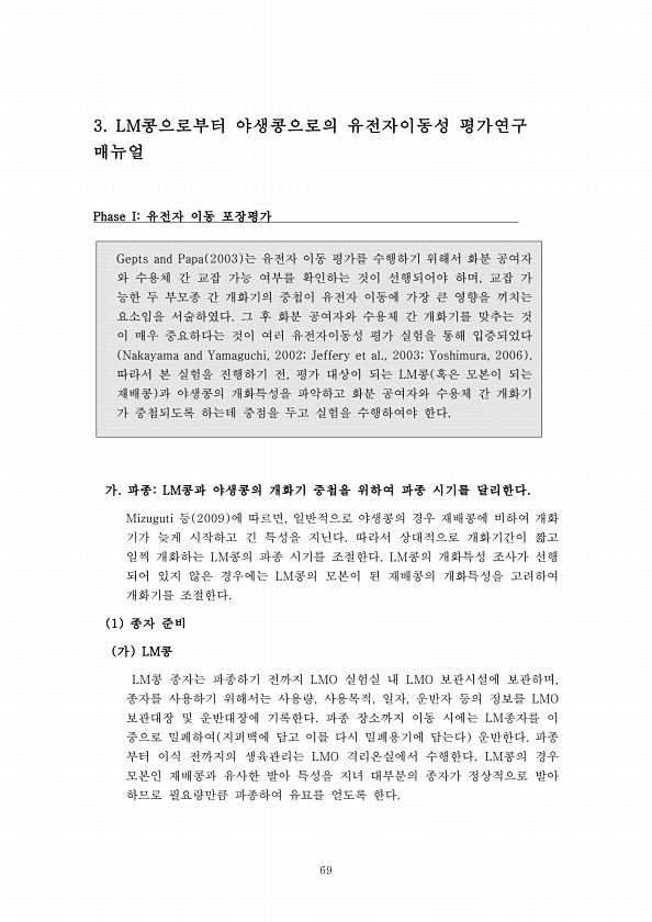 69 3. LM콩으로부터 야생콩으로의 유전자이동성 평가연구 매뉴얼 Phase I유전자 이동 포장평가 Gepts and Papa 2003 는 유전자 이동 평가를 수행하기 위해서 화분 공여자 와 수용체 간 교잡 가능 여부를 확인하는 것이 선행되어야 하며, 교잡 가 능한 두 부모종 간 개화기의 중첩이 유전자 이동에 가장 큰 영향을 끼치는 요소임을 서술하였다. 그 후 화분 공여자와 수용체 간 개화기를 맞추는 것 이 매우 중요하다는 것이 여러 유전자이동성 평가 실험을 통해 입증되었다 Nakayama and Yamaguchi, 2002; Jeffery et al., 2003; Yoshimura, 2006 따라서 본 실험을 진행하기 전, 평가 대상이 되는 LM콩 혹은 모본이 되는 재배콩 과 야생콩의 개화특성을 파악하고 ...