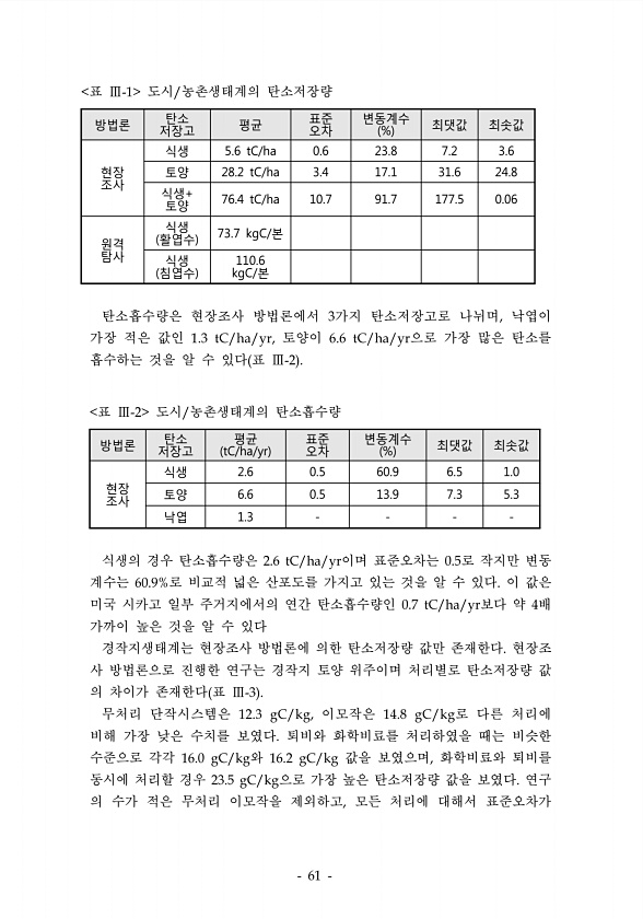 방법론 탄소 저장고 평균 표준 오차 변동계수 % 최댓값 최솟값 현장 조사 식생 5.6 tC/ha 0.6 23.8 7.2 3.6 토양 28.2 tC/ha 3.4 17.1 31.6 24.8 식생+ 토양 76.4 tC/ha 10.7 91.7 177.5 0.06 원격 탐사 식생 활엽수 73.7 kgC/본 식생 침엽수 110.6 kgC/본 표 도시 농촌생태계의 탄소저장량 방법론 탄소 저장고 평균 tC/ha/yr 표준 오차 변동계수 % 최댓값 최솟값 현장 조사 식생 2.6 0.5 60.9 6.5 1.0 토양 6.6 0.5 13.9 7.3 5.3 낙엽 1.3 표 도시 농촌생태계의 탄소흡수량 탄소흡수량은 현장조사 방법론에서 가지 탄소저장고로 나뉘며 낙엽이 가장 적은 값인 토양이 으로 가장 많은 탄소를 흡수하는 것을 알 수...