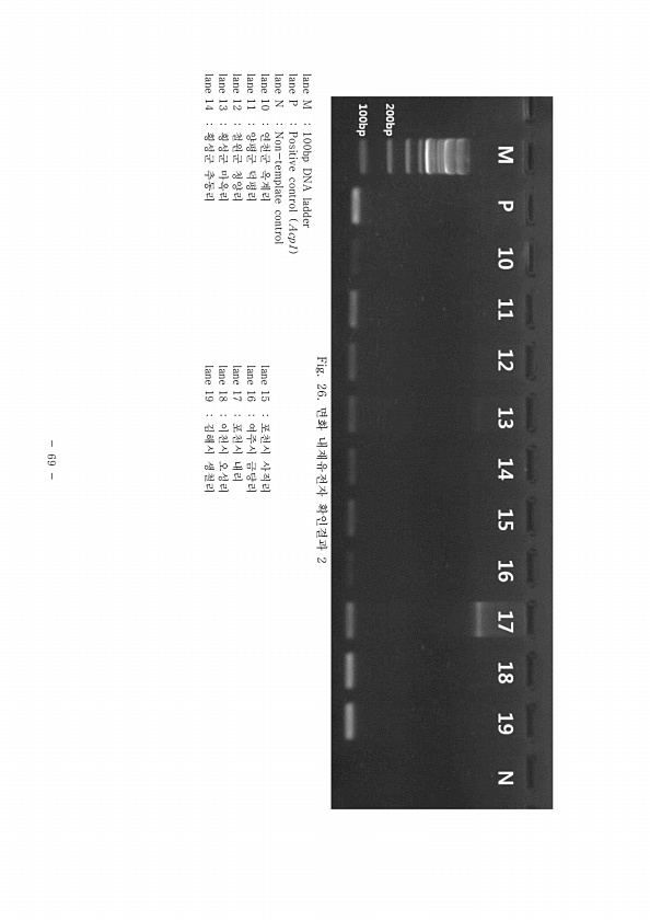 69 Fig. 26. 면화 내재유전자 확인결과 2 lane M 100bp DNA ladder lane P Positive control Acp1 lane N Non-template control lane 10 연천군 옥계리 lane 15 포천시 사직리 lane 11 양평군 덕평리 lane 16 여주시 금당리 lane 12 철원군 청양리 lane 17 포천시 내리 lane 13 횡성군 마옥리 lane 18 이천시 오성리 lane 14 횡성군 추동리 lane 19 김해시생철리