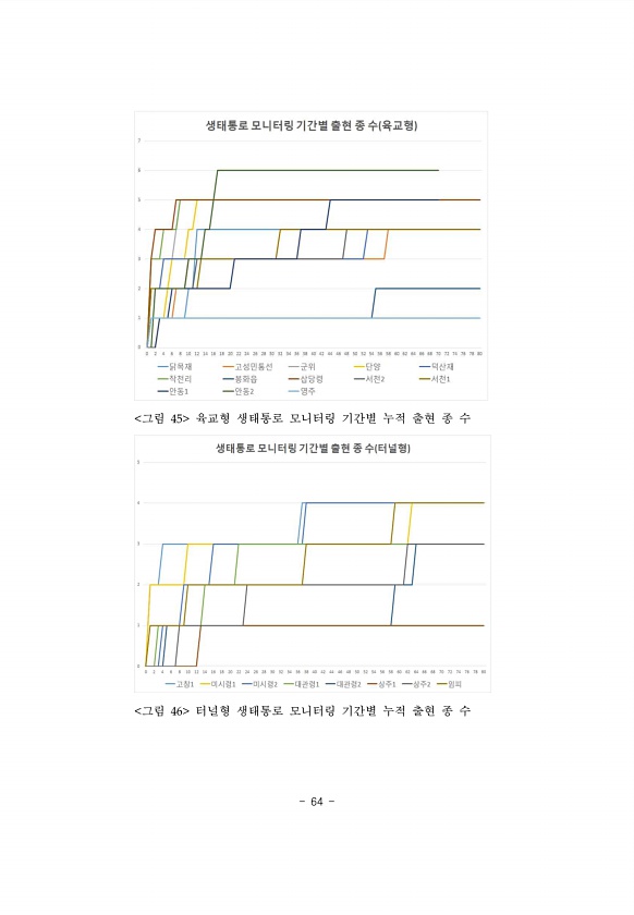 64 그림 45 육교형 생태통로 모니터링 기간별 누적 출현 종 수 그림 46 터널형 생태통로 모니터링 기간별 누적 출현 종수