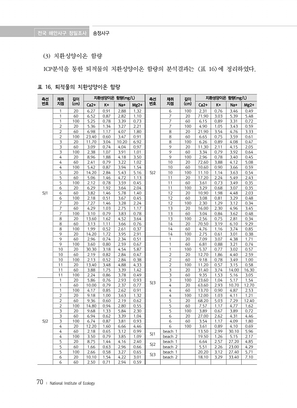 전국 해안사구 정밀조사 송정사구 70 ? National Institute of Ecology 3 치환성양이온 함량 ICP분석을 통한 퇴적물의 치환성양이온 함량의 분석결과는 표 16 에 정리하였다. 측선 번호 채취 지점 깊이 cm 치환성양이온 함량 mg/L 측선 번호 채취 지점 깊이 cm 치환성양이온 함량 mg/L Ca2+ K+ Na+ Mg2+ Ca2+ K+ Na+ Mg2+ SJ1 1 20 6.27 0.91 2.88 1.32 SJ2 6 100 2.31 0.76 3.46 0.49 1 60 6.52 0.87 2.82 1.10 7 20 71.90 3.03 5.39 5.48 1 100 5.25 0.78 3.39 0.73 7 60 6.15 0.89 3.31 0.72 2 20 5.36 1.34 3.27 2.21 7 1...