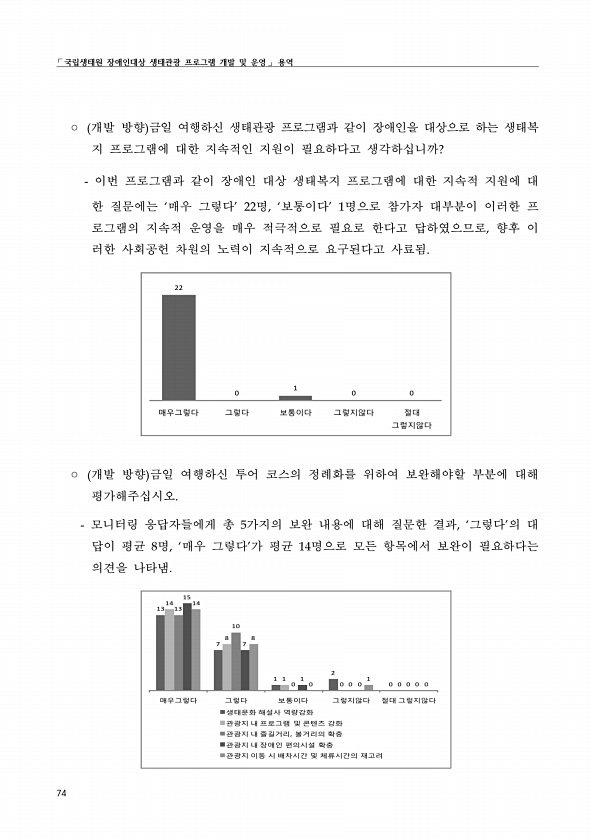 ?국립생태원 장애인대상 생태관광 프로그램 개발 및 운영? 용역 74 ? 개발 방향 금일 여행하신 생태관광 프로그램과 같이 장애인을 대상으로 하는 생태복 지 프로그램에 대한 지속적인 지원이 필요하다고 생각하십니까? 이번 프로그램과 같이 장애인 대상 생태복지 프로그램에 대한 지속적 지원에 대 한 질문에는 ‘매우 그렇다’ 22명, ‘보통이다’ 1명으로 참가자 대부분이 이러한 프 로그램의 지속적 운영을 매우 적극적으로 필요로 한다고 답하였으므로, 향후 이 러한 사회공헌 차원의 노력이 지속적으로 요구된다고 사료됨. 22 0 1 0 0 매우그렇다 그렇다 보통이다 그렇지않다 절대 그렇지않다 ? 개발 방향 금일 여행하신 투어 코스의 정례화를 위하여 보완해야할 부분에 대해 평가해주십시오. 모니터링 응답자들에게 총 5가지의 ...