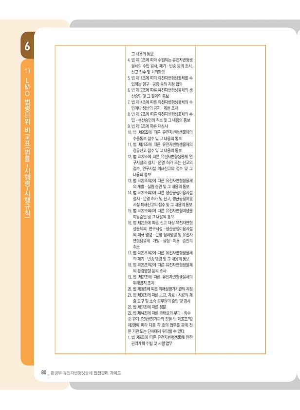 6 80 _ 환경부 유전자변형생물체 안전관리 가이드 1 L M O 법령단위 비교표 법률- 시행령- 시행규칙 그 내용의 통보 4. 법 제10조에 따라 수입되는 유전자변형생 물체의 수입 검사, 폐기ㆍ반송 등의 조치, 신고 접수 및 처리명령 5. 법 제11조에 따라 유전자변형생물체를 수 입하는 항구ㆍ공항 등의 지정 협의 6. 법 제12조에 따른 유전자변형생물체의 생 산승인 및 그 결과의 통보 7. 법 제14조에 따른 유전자변형생물체의 수 입이나 생산의 금지ㆍ제한 조치 8. 법 제17조에 따른 유전자변형생물체의 수 입ㆍ생산승인의 취소 및 그 내용의 통보 9. 법 제18조에 따른 재심사 10. 법 제20조에 따른 유전자변형생물체의 수출통보 접수 및 그 내용의 통보 11. 법 제21조에 따른 유전자변형생물체의 경유신고...