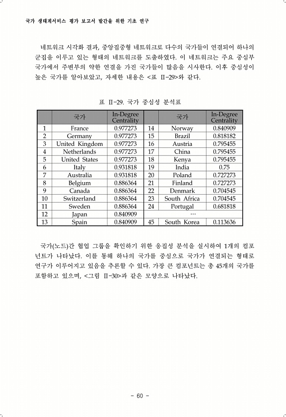 국가 생태계서비스 평가 보고서 발간을 위한 기초 연구 60 네트워크 시각화 결과, 중앙집중형 네트워크로 다수의 국가들이 연결되어 하나의 군집을 이루고 있는 형태의 네트워크를 도출하였다. 이 네트워크는 주요 중심부 국가에서 주변부의 약한 연결을 가진 국가들이 많음을 시사한다. 이후 중심성이 높은 국가를 알아보았고, 자세한 내용은 표 Ⅱ 29 와 같다. 국가 Centrality In-Degree 국가 Centrality In-Degree 1 France 0.977273 14 Norway 0.840909 2 Germany 0.977273 15 Brazil 0.818182 3 United Kingdom 0.977273 16 Austria 0.795455 4 Netherlands 0.977273 17 China 0....