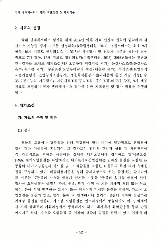 국가 생태계서비스 평가 지표선정 및 평가적용 52 2. 지표의 선정 국내 생태계서비스 평가를 위해 2014년 이후 지표 선정의 원칙에 입각하여 각 서비스 기능별 평가 지표를 선정하였다 국립생태원, 2014 조절서비스는 최초 9개 항목, 16개 지표로 선정되었으며, 2015년 시범평가 및 전문가 자문을 통하여 최종 적으로 7개 항목, 17개 지표로 정리되었다 국립생태원, 2015 2016년도에는 전년도 연구결과를 토대로 대기조절 대기오염부하 저감기능 평가 , 온실가스조절 온실가스 흡수/축적량 평가 , 수질조절 오염부하량의 발생/배출량 평가 , 침식조절 토양침식 조절기능평가, 연안침식조절평가 , 생물학적환경조절 외래종의 침입 저감 기능 , 수 분 수분기능의 가치평가 , 자연재해조절 풍속조절, 홍수조절 의 7개 ...