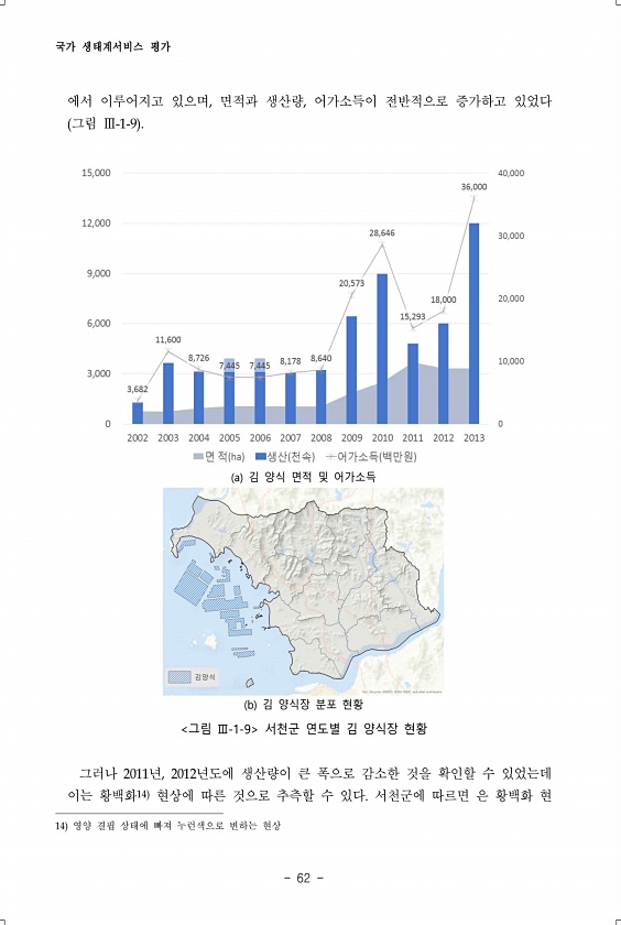 국가 생태계서비스 평가 62 에서 이루어지고 있으며, 면적과 생산량, 어가소득이 전반적으로 증가하고 있었다 그림 Ⅲ-1-9 a 김 양식 면적 및 어가소득 b 김 양식장 분포 현황 그림 Ⅲ-1-9 서천군 연도별 김 양식장 현황 그러나 2011년, 2012년도에 생산량이 큰 폭으로 감소한 것을 확인할 수 있었는데 이는 황백화14 현상에 따른 것으로 추측할 수 있다. 서천군에 따르면 은 황백화 현 14 영양 결핍 상태에 빠져 누런색으로 변하는현상