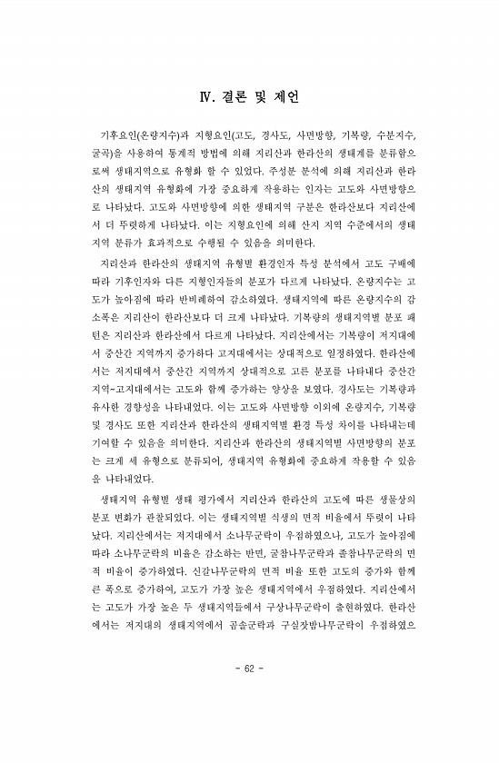 62 Ⅳ. 결론 및 제언 기후요인 온량지수 과 지형요인 고도, 경사도, 사면방향, 기복량, 수분지수, 굴곡 을 사용하여 통계적 방법에 의해 지리산과 한라산의 생태계를 분류함으 로써 생태지역으로 유형화 할 수 있었다. 주성분 분석에 의해 지리산과 한라 산의 생태지역 유형화에 가장 중요하게 작용하는 인자는 고도와 사면방향으 로 나타났다. 고도와 사면방향에 의한 생태지역 구분은 한라산보다 지리산에 서 더 뚜렷하게 나타났다. 이는 지형요인에 의해 산지 지역 수준에서의 생태 지역 분류가 효과적으로 수행될 수 있음을 의미한다. 지리산과 한라산의 생태지역 유형별 환경인자 특성 분석에서 고도 구배에 따라 기후인자와 다른 지형인자들의 분포가 다르게 나타났다. 온량지수는 고 도가 높아짐에 따라 반비례하여 감소하였다. 생태지역...