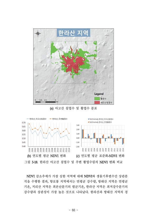 66 아고산 침엽수 및 활엽수 분포 연도별 평균 변화 연도별 평균 표준화 변화 그림 한라산 아고산 침엽수 및 주변 활엽수림의 변화 비교 감소추세가 가장 심한 지역에 대해 와 생물기후변수간 상관분 석을 수행한 결과 향로봉 지역에서는 연평균 강수량 방태산 지역은 연평균 기온 지리산 지역은 최온난분기의 평균기온 한라산 지역은 최저강수분기의 강수량과 상관성이 가장 높은 것으로 나타났다 한라산과 방태산 지역의경