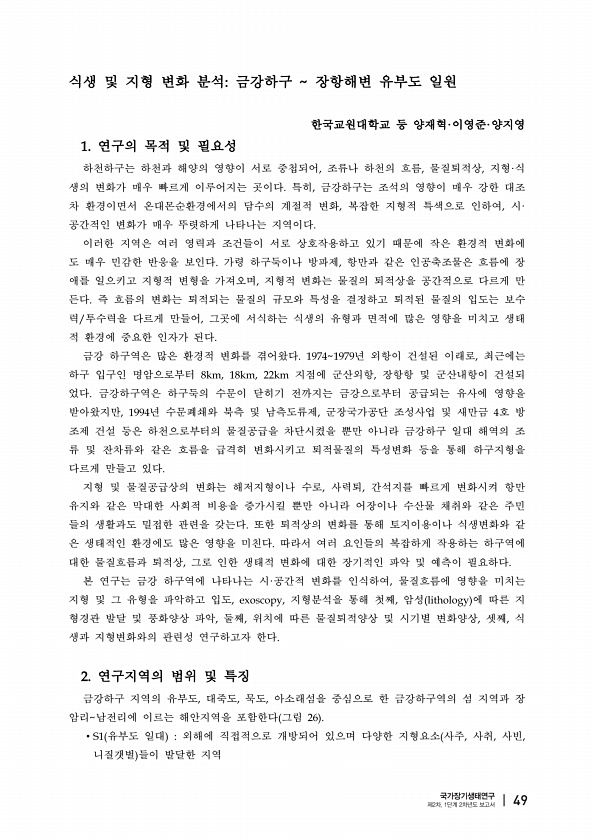 식생 및 지형 변화 분석 금강하구 장항해변 유부도 일원 한국교원대학교 등 양재혁 이영준 양지영 연구의 목적 및 필요성 하천하구는 하천과 해양의 영향이 서로 중첩되어 조류나 하천의 흐름 물질퇴적상 지형 식 생의 변화가 매우 빠르게 이루어지는 곳이다 특히 금강하구는 조석의 영향이 매우 강한 대조 차 환경이면서 온대몬순환경에서의 담수의 계절적 변화 복잡한 지형적 특색으로 인하여 시 공간적인 변화가 매우 뚜렷하게 나타나는 지역이다 이러한 지역은 여러 영력과 조건들이 서로 상호작용하고 있기 때문에 작은 환경적 변화에 도 매우 민감한 반응을 보인다 가령 하구둑이나 방파제 항만과 같은 인공축조물은 흐름에 장 애를 일으키고 지형적 변형을 가져오며 지형적 변화는 물질의 퇴적상을 공간적으로 다르게 만 든다 즉 흐름의 변화는 ...
