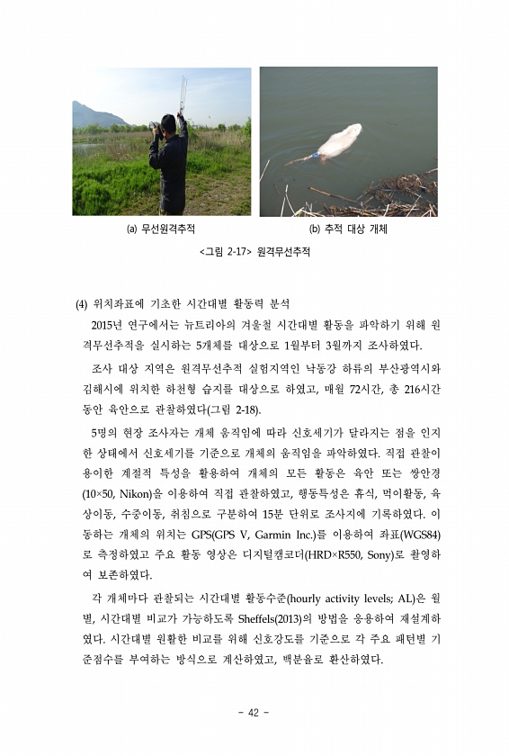 ? ? ? ? ? ? ? 4 위치좌표에 기초한 시간대별 활동력 분석 2015년 연구에서는 뉴트리아의 겨울철 시간대별 활동을 파악하기 위해 원 격무선추적을 실시하는 5개체를 대상으로 1월부터 3월까지 조사하였다. 조사 대상 지역은 원격무선추적 실험지역인 낙동강 하류의 부산광역시와 김해시에 위치한 하천형 습지를 대상으로 하였고, 매월 72시간, 총 216시간 동안 육안으로 관찰하였다 그림 2-18 5명의 현장 조사자는 개체 움직임에 따라 신호세기가 달라지는 점을 인지 한 상태에서 신호세기를 기준으로 개체의 움직임을 파악하였다. 직접 관찰이 용이한 계절적 특성을 활용하여 개체의 모든 활동은 육안 또는 쌍안경 10×50, Nikon 을 이용하여 직접 관찰하였고, 행동특성은 휴식, 먹이활동, 육 상이동, 수중이동, ...
