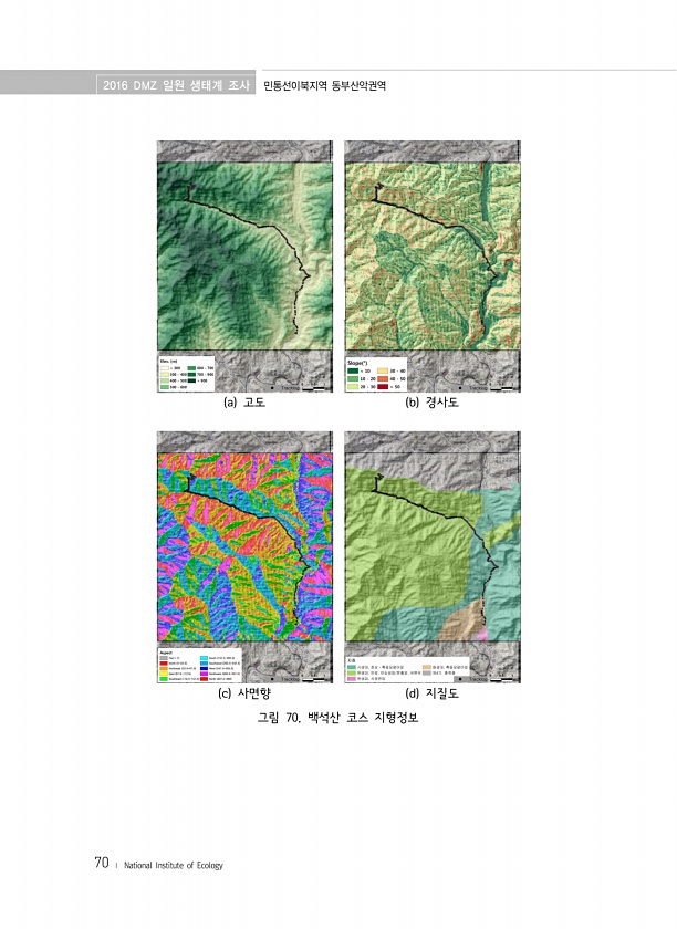 2016 DMZ 일원 생태계 조사 민통선이북지역 동부산악권역 70 ? National Institute of Ecology a 고도 b 경사도 c 사면향 d 지질도 그림 70. 백석산 코스지형정보