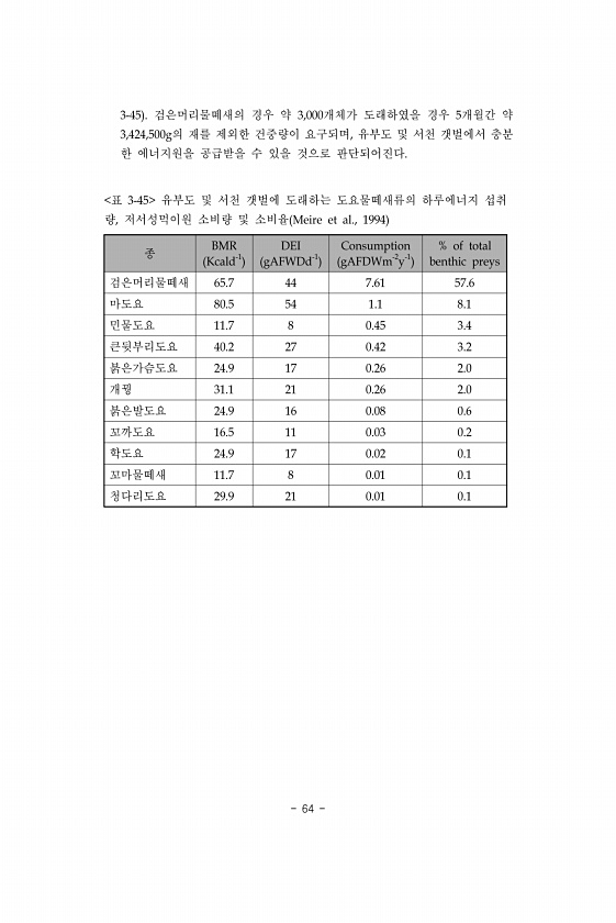 64 3-45 검은머리물떼새의 경우 약 3,000개체가 도래하였을 경우 5개월간 약 3,424,500g의 재를 제외한 건중량이 요구되며, 유부도 및 서천 갯벌에서 충분 한 에너지원을 공급받을 수 있을 것으로 판단되어진다. 종 BMR Kcald-1 DEI gAFWDd-1 Consumption gAFDWm-2y-1 % of total benthic preys 검은머리물떼새 65.7 44 7.61 57.6 마도요 80.5 54 1.1 8.1 민물도요 11.7 8 0.45 3.4 큰뒷부리도요 40.2 27 0.42 3.2 붉은가슴도요 24.9 17 0.26 2.0 개꿩 31.1 21 0.26 2.0 붉은발도요 24.9 16 0.08 0.6 꼬까도요 16.5 11 0.03 0.2 학도요 24.9 17 0.02 0.1...