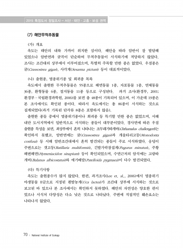 2015 특정도서 정밀조사 서산·태안·고흥·보성 권역 70 ? National Institute of Ecology 7 해안무척추동물 가 개요 옥도는 태안의 내륙 가까이 위치한 섬이다. 해안을 따라 암반이 잘 발달해 있었으나 암반면과 굴곡이 단순하여 무척추동물이 서식하기에 적당하지 않았다. 조사는 조간대의 상부에서 이루어졌으며, 특별히 주목할 만한 종은 없었다. 우점종은 굴 Crassostrea gigas , 사각게 Sesarma pictum 등이 대표적이었다. 나 출현종, 멸종위기종 및 희귀종 목록 옥도에서 출현한 무척추동물은 55종으로 해면동물 1종, 자포동물 1종, 연체동물 36종, 환형동물 6종, 절지동물 11종 등으로 구성된다. 과거 조사 환경부, 2001; 환경부·국립환경과학원, 2006 를 보면...