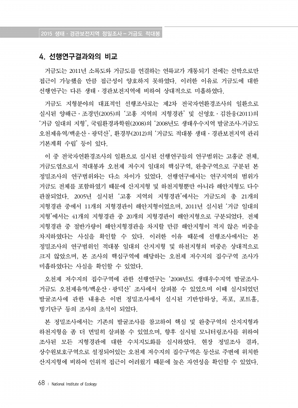 2015 생태·경관보전지역 정밀조사 거금도 적대봉 68 ? National Institute of Ecology 4. 선행연구결과와의 비교 거금도는 2011년 소록도와 거금도를 연결하는 연륙교가 개통되기 전에는 선박으로만 접근이 가능했을 만큼 접근성이 양호하지 못하였다. 이러한 이유로 거금도에 대한 선행연구는 다른 생태·경관보전지역에 비하여 상대적으로 미흡하였다. 거금도 지형분야의 대표적인 선행조사로는 제2차 전국자연환경조사의 일환으로 실시된 양해근·조경민 2005 의 ‘고흥 지역의 지형경관’ 및 신영호·김찬웅 2011 의 ‘거금 일대의 지형’, 국립환경과학원 2008 의 ‘2008년도 생태우수지역 발굴조사-거금도 오천제유역/백운산·광덕산’, 환경부 2012 의 ‘거금도 적대봉 생태·경관보전지역 관리 기본계...