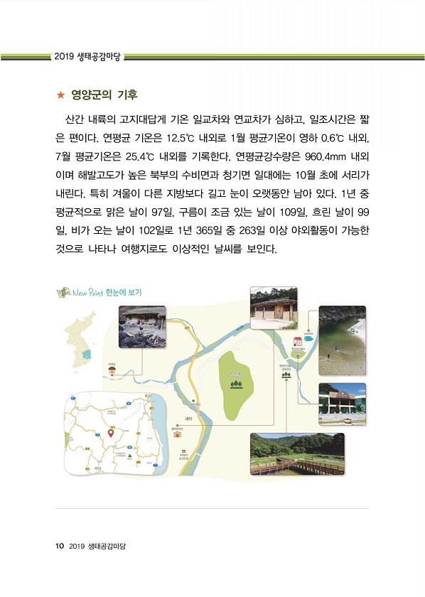 10 2019 생태공감마당 ★ 영양군의 기후 산간 내륙의 고지대답게 기온 일교차와 연교차가 심하고, 일조시간은 짧 은 편이다. 연평균 기온은 12.5℃ 내외로 1월 평균기온이 영하 0.6℃ 내외, 7월 평균기온은 25.4℃ 내외를 기록한다. 연평균강수량은 960.4mm 내외 이며 해발고도가 높은 북부의 수비면과 청기면 일대에는 10월 초에 서리가 내린다. 특히 겨울이 다른 지방보다 길고 눈이 오랫동안 남아 있다. 1년 중 평균적으로 맑은 날이 97일, 구름이 조금 있는 날이 109일, 흐린 날이 99 일, 비가 오는 날이 102일로 1년 365일 중 263일 이상 야외활동이 가능한 것으로 나타나 여행지로도 이상적인 날씨를보인다.
