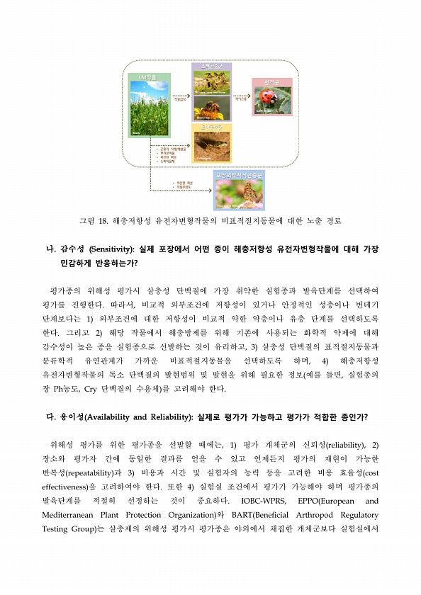 그림 18. 해충저항성 유전자변형작물의 비표적절지동물에 대한 노출 경로 나. 감수성 Sensitivity 실제 포장에서 어떤 종이 해충저항성 유전자변형작물에 대해 가장 민감하게 반응하는가? 평가종의 위해성 평가시 살충성 단백질에 가장 취약한 실험종과 발육단계를 선택하여 평가를 진행한다. 따라서, 비교적 외부조건에 저항성이 있거나 안정적인 성충이나 번데기 단계보다는 1 외부조건에 대한 저항성이 비교적 약한 약충이나 유충 단계를 선택하도록 한다. 그리고 2 해당 작물에서 해충방제를 위해 기존에 사용되는 화학적 약제에 대해 감수성이 높은 종을 실험종으로 선발하는 것이 유리하고, 3 살충성 단백질의 표적절지동물과 분류학적 유연관계가 가까운 비표적절지동물을 선택하도록 하며, 4 해충저항성 유전자변형작물의 독소 단백질...