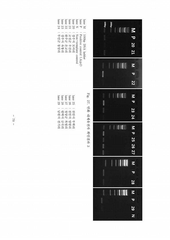 70 Fig. 27. 면화 내재유전자 확인결과 3 lane M 100bp DNA ladder lane P Positive control Acp1 lane N Non-template control lane 20 경주시 모아리 lane 25 천안시 무학리 lane 21 고성군 우산리 lane 26 천안시 양령리 lane 22 완주군 은교리 lane 27 청양군 록평리 lane 23 경주시 육통리 lane 28 평택시 금곡리 lane 24 무안군 동암리 lane 29 남원시진기리