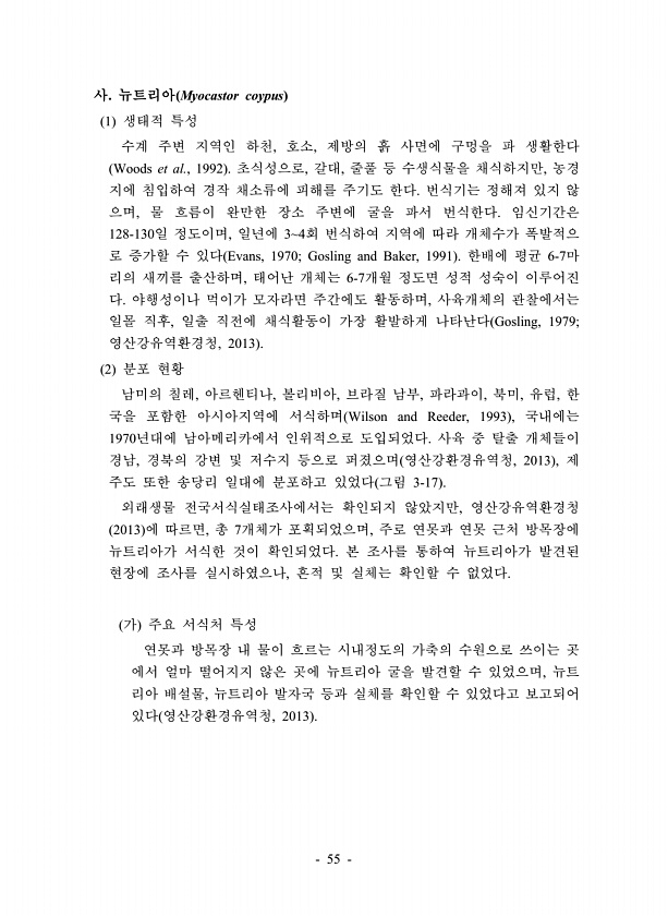 55 사. 뉴트리아 Myocastor coypus 1 생태적 특성 수계 주변 지역인 하천, 호소, 제방의 흙 사면에 구멍을 파 생활한다 Woods et al., 1992 초식성으로, 갈대, 줄풀 등 수생식물을 채식하지만, 농경 지에 침입하여 경작 채소류에 피해를 주기도 한다. 번식기는 정해져 있지 않 으며, 물 흐름이 완만한 장소 주변에 굴을 파서 번식한다. 임신기간은 128-130일 정도이며, 일년에 34회 번식하여 지역에 따라 개체수가 폭발적으 로 증가할 수 있다 Evans, 1970; Gosling and Baker, 1991 한배에 평균 6-7마 리의 새끼를 출산하며, 태어난 개체는 6-7개월 정도면 성적 성숙이 이루어진 다. 야행성이나 먹이가 모자라면 주간에도 활동하며, 사육개체의 관찰에서는 일몰 ...