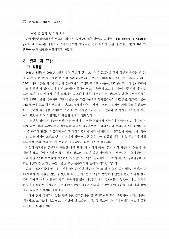 70 2015 독도 생태계 정밀조사 다 종 동정 및 학명 정리 한국식물분류학회에서 비교적 최근에 출판 2007 한 한반도 속식물지 The genera of vascular plants of Korea 를 중심으로 이루어졌으며, 학문적인 견해 차이가 있을 경우에는 이 1980 과 이 1996 등의 문헌을 이용하기도 하였다. 3. 결과 및 고찰 가. 식물상 2015년 5월부터 2016년 1월에 걸쳐 독도의 현지 조사의 확증표본을 통해 확인된 종수는 총 28 과 49속 50종 1아종 3변종 등 도합 54분류군이다 표 25-1 선태식물은 7과 7속 8분류군이다 표 25-2 나자식물은 과거에 곰솔이 울릉도에서 도입된 것으로 기록 이, 1952 된 후 선과 김 1998 에 서도 확인된 바 있다. 그러나 본 조사를 비롯...