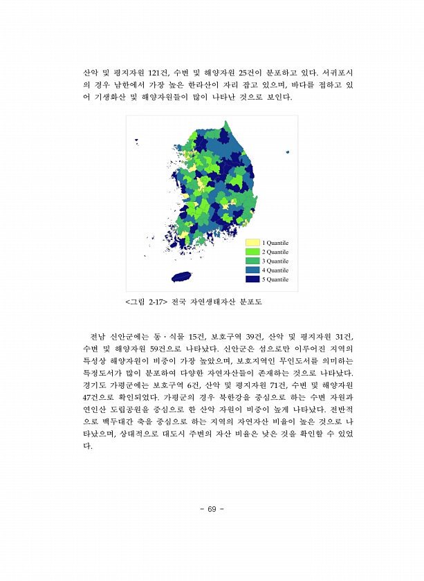 69 그림 전국 자연생태자산 분포도 산악 및 평지자원 건 수변 및 해양자원 건이 분포하고 있다 서귀포시 의 경우 남한에서 가장 높은 한라산이 자리 잡고 있으며 바다를 접하고 있 어 기생화산 및 해양자원들이 많이 나타난 것으로 보인다 전남 신안군에는 동 식물 건 보호구역 건 산악 및 평지자원 건 수변 및 해양자원 건으로 나타났다 신안군은 섬으로만 이루어진 지역의 특성상 해양자원이 비중이 가장 높았으며 보호지역인 무인도서를 의미하는 특정도서가 많이 분포하여 다양한 자연자산들이 존재하는 것으로 나타났다 경기도 가평군에는 보호구역 건 산악 및 평지자원 건 수변 및 해양자원 건으로 확인되었다 가평군의 경우 북한강을 중심으로 하는 수변 자원과 연인산 도립공원을 중심으로 한 산악 자원이 비중이 높게 나타났다 전반적 으로...