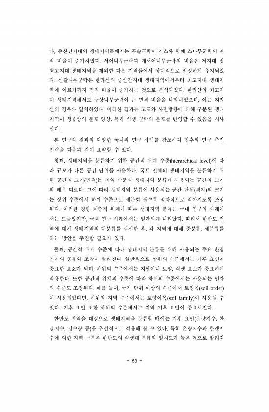 63 나, 중산간지대의 생태지역들에서는 곰솔군락의 감소와 함께 소나무군락의 면 적 비율이 증가하였다. 서어나무군락과 개서어나무군락의 비율은 저지대 및 최고지대 생태지역을 제외한 다른 지역들에서 상대적으로 일정하게 유지되었 다. 신갈나무군락은 한라산의 중산간지대 생태지역에서부터 최고지대 생태지 역에 이르기까지 면적 비율이 증가하는 것으로 분석되었다. 한라산의 최고지 대 생태지역에서도 구상나무군락이 큰 면적 비율을 나타내었으며, 이는 지리 산의 경우와 일치하였다. 이러한 결과는 고도와 사면방향에 의해 구분된 생태 지역이 생물상의 분포 양상, 특히 식생 군락의 분포를 반영할 수 있음을 시사 한다. 본 연구의 결과와 다양한 국내외 연구 사례를 참조하여 향후의 연구 추진 전략을 다음과 같이 요약할 수 있다. 첫째, ...