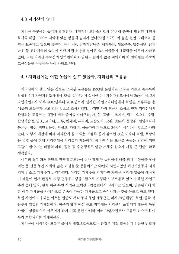 80 국가장기생태연구 4.8 지리산의 습지 지리산 곳곳에는 습지가 발견된다. 대표적인 고산습지로서 90년대 중반에 발견된 대원사 북서쪽 해발 1000m 지역에 있는 왕등재 습지가 있다 사진 3.23 이 늪은 천연 그대로의 원 형을 보존하고 있으며 숫잔대, 동의나물, 감자개발나물, 애기부들, 세모부추, 방울새난, 닭의 난초 등 고산지역의 습지에 오랜 세월 적응해 살아온 습지식물들이 대군락을 이루며 자라고 있다. 또한 지리산 주능선의 연하천대피소 일대도 습지가 많은 지역이며 이 일대에는 북방계 고산식물인 두루미꽃 등이 자라고 있다. 4.9 지리산에는 어떤 동물이 살고 있을까, 지리산의 포유류 지리산에서 살고 있는 것으로 조사된 포유류는 1993년 문헌자료 조사를 기초로 종목록이 작성된 1기 자연자원조사에서 38...