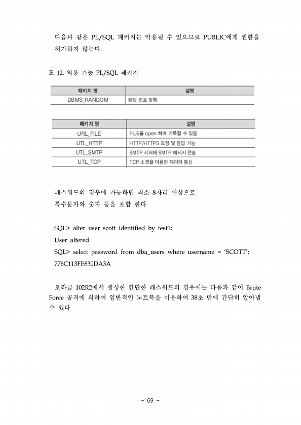 다음과 같은 PL/SQL 패키지는 악용될 수 있으므로 PUBLIC에게 권한을 허가하지 않는다. 표 12. 악용 가능 PL/SQL 패키지 패스워드의 경우에 가능하면 최소 8자리 이상으로 특수문자와 숫자 등을 포함 한다 SQL alter user scott identified by test1; User altered. SQL select password from dba_users where username = SCOTT; 776C113FE830DA3A 오라클 102R2에서 생성한 간단한 패스워드의 경우에는 다음과 같이 Brute Force 공격에 의하여 일반적인 노트북을 이용하여 38초 만에 간단히 알아낼 수있다