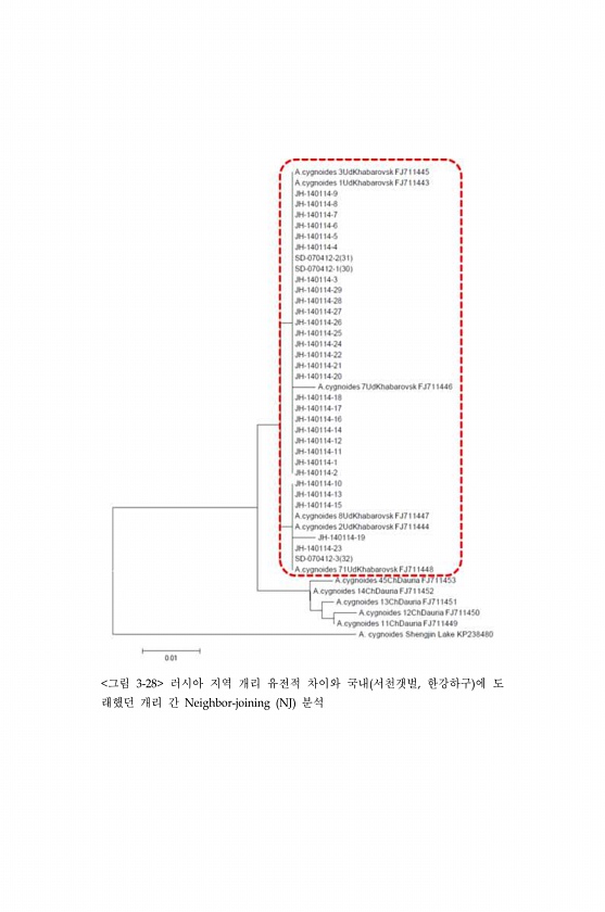 그림 3-28 러시아 지역 개리 유전적 차이와 국내 서천갯벌, 한강하구 에 도 래했던 개리 간 Neighbor-joining NJ분석