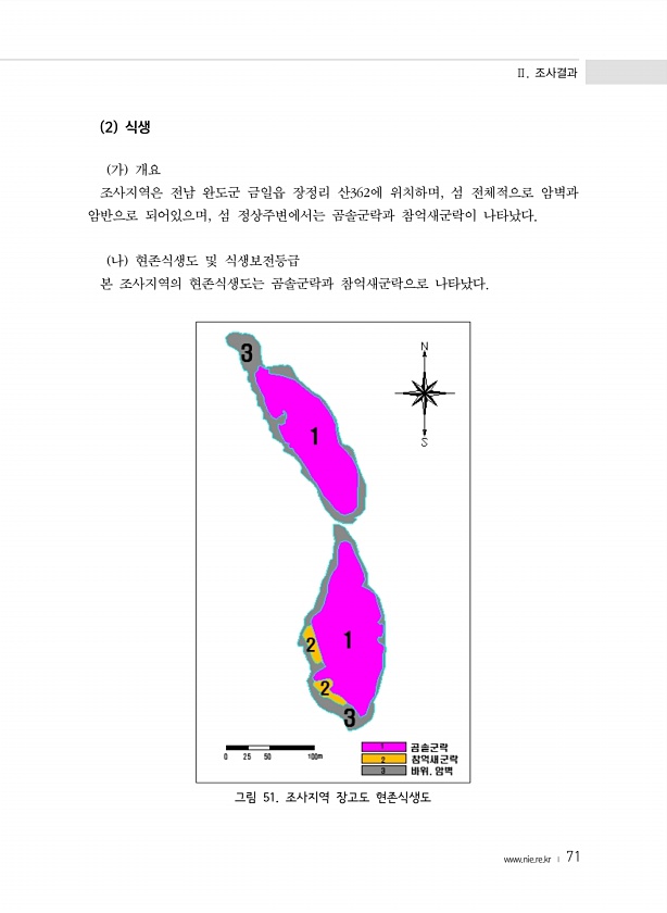 Ⅱ. 조사결과 www.nie.re.kr ? 71 2 식생 가 개요 조사지역은 전남 완도군 금일읍 장정리 산362에 위치하며, 섬 전체적으로 암벽과 암반으로 되어있으며, 섬 정상주변에서는 곰솔군락과 참억새군락이 나타났다. 나 현존식생도 및 식생보전등급 본 조사지역의 현존식생도는 곰솔군락과 참억새군락으로 나타났다. 그림 51. 조사지역 장고도현존식생도
