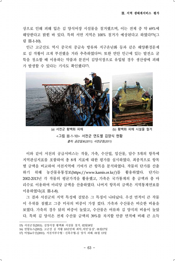 Ⅲ. 지역 생태계서비스 평가 63 상으로 인해 피해 입은 김 양식어장 시설물을 철거했으며, 이는 전체 중 약 69%에 해당한다고 밝힌 바 있다. 특히 서면 지역은 100% 철거가 예상된다고 하였다15 그 림 Ⅲ-1-10 인근 고군산도 역시 중국의 중금속 방류와 지구온난화 등과 같은 해양환경문제 로 김 작황이 크게 부진했을 거라 추측하였다16 또한 연안 인근에 있는 발전소 굴 뚝을 청소할 때 이용하는 약품과 분진이 김양식장으로 유입될 경우 생산량에 피해 가 발생할 수 있다는 기사도 확인했다17 a 서천군 황백화 피해 b 황백화 피해 시설물 철거 그림 Ⅲ-1-10 서천군 연도별 김양식 현황 출처금강일보 2011 , 서천군청 2011 이와 같이 서천의 공급서비스는 작물, 가축, 수산업, 임산물, 담수 5개의 항목...