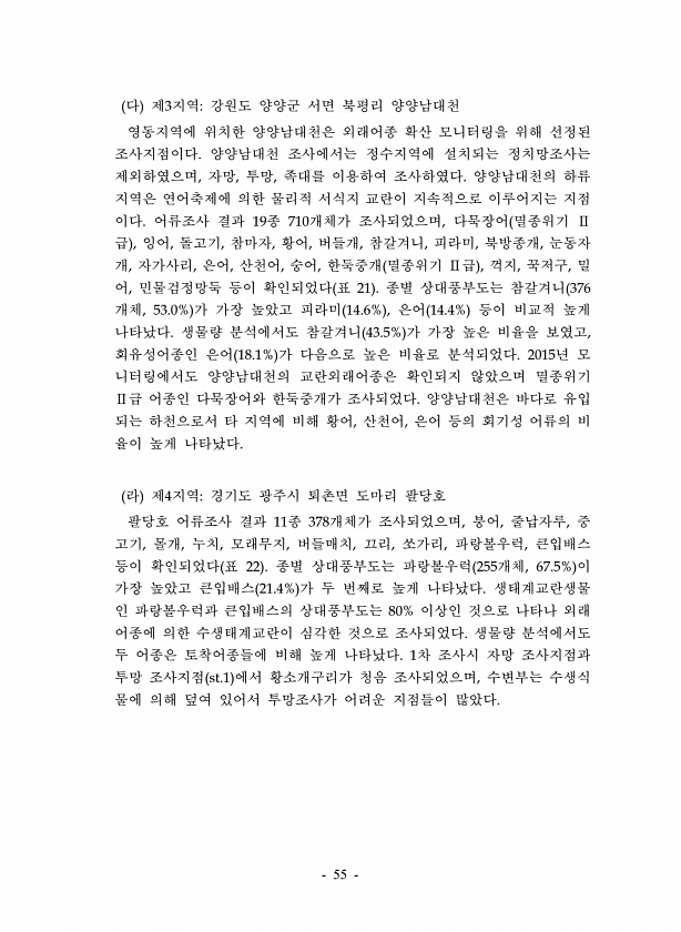 55 다 제3지역강원도 양양군 서면 북평리 양양남대천 영동지역에 위치한 양양남대천은 외래어종 확산 모니터링을 위해 선정된 조사지점이다. 양양남대천 조사에서는 정수지역에 설치되는 정치망조사는 제외하였으며, 자망, 투망, 족대를 이용하여 조사하였다. 양양남대천의 하류 지역은 연어축제에 의한 물리적 서식지 교란이 지속적으로 이루어지는 지점 이다. 어류조사 결과 19종 710개체가 조사되었으며, 다묵장어 멸종위기 Ⅱ 급 , 잉어, 돌고기, 참마자, 황어, 버들개, 참갈겨니, 피라미, 북방종개, 눈동자 개, 자가사리, 은어, 산천어, 숭어, 한둑중개 멸종위기 Ⅱ급 , 꺽지, 꾹저구, 밀 어, 민물검정망둑 등이 확인되었다 표 21 종별 상대풍부도는 참갈겨니 376 개체, 53.0% 가 가장 높았고 피라미 14.6% ,...
