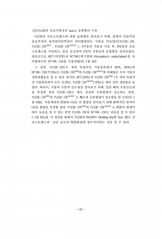 65 3 YUC6의 건조저항성과 auxin 표현형의 구분 YUC6의 건조스트레스에 대한 표현형을 알아보기 위해, 앞에서 만들어진 중요부위의 돌연변이단백질이 과다발현되는 식물을 만들었다 YUC6- OX, YUC6- OXC85S , YUC6- OXmNADP 3주동안 식물을 키운 후, 9일동안 건조 스트레스를 처리하고, 물을 공급하여 2일뒤 식물들의 표현형을 살펴보았다. 대조군으로 WT 야생형 과 NT RA 애기장대 thioredoxin reductases 를 과 다발현시킨 NT RA- OX를 사용하였다 그림 43 그 결과, YUC6- OX 두 개의 독립적인 식물종류에서 40%, 60% 와 NTRA- OX 77.5% 는 YUC6- OXC85S와 YUC6- OXmNADP에 비해많은 수의 식물이 생존하였음을 알 수 ...