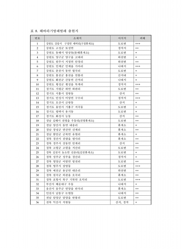 61 번호 소재지 서식지 피해 1 강원도 강릉시 구정면 제비리 구정휴게소 도로변 +++ 2 강원도 고성군 토성면 경작지 ++ 3 강원도 동해시 망상동 동해휴게소 도로변 + 4 강원도 양구군 양구읍 고대리 하천변 + 5 강원도 원주시 지정면 안창리 하천변 ++ 6 강원도 인제군 인제읍 가아리 나대지 +++ 7 강원도 춘천시 동면 월곡리 도로변 + 8 강원도 홍천군 홍천읍 연봉리 산지내 + 9 강원도 화천군 간동면 간척리 나대지 + 10 강원도 횡성군 횡성읍 묵계리 경작지 +++ 11 경기도 가평군 하면 하판리 도로변 ++ 12 경기도 시흥시 정왕동 산지 ++ 13 경기도 안성시 미양면 구수리 경작지 +++ 14 경기도 오산시 금왕동 산지 + 15 경기도 용인시 기흥구 지곡동 도로변 + 16 경기도 평택시 용기...