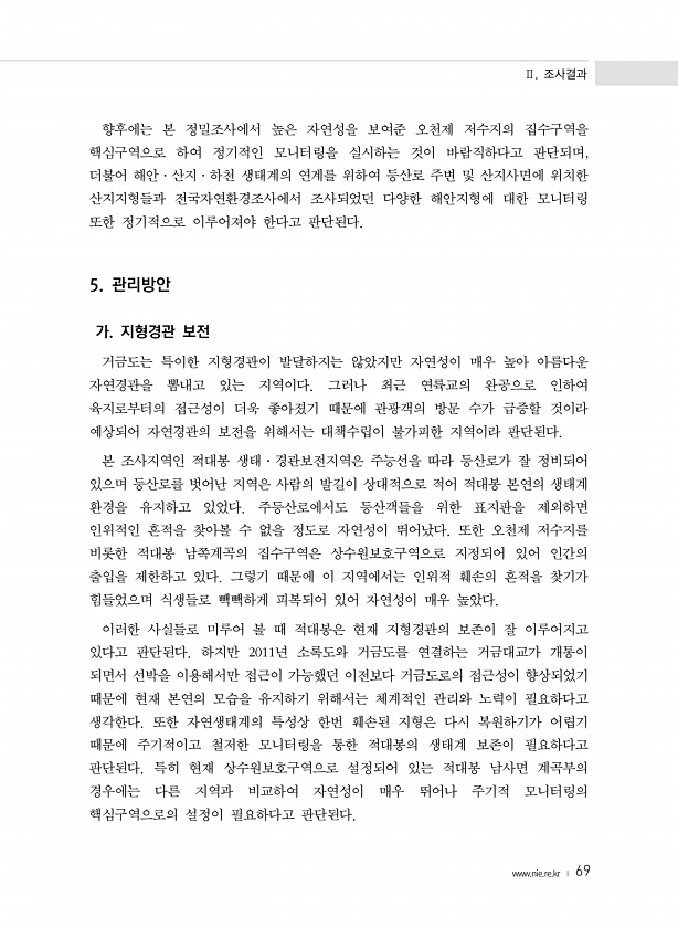 Ⅱ. 조사결과 www.nie.re.kr ? 69 향후에는 본 정밀조사에서 높은 자연성을 보여준 오천제 저수지의 집수구역을 핵심구역으로 하여 정기적인 모니터링을 실시하는 것이 바람직하다고 판단되며, 더불어 해안·산지·하천 생태계의 연계를 위하여 등산로 주변 및 산지사면에 위치한 산지지형들과 전국자연환경조사에서 조사되었던 다양한 해안지형에 대한 모니터링 또한 정기적으로 이루어져야 한다고 판단된다. 5. 관리방안 가. 지형경관 보전 거금도는 특이한 지형경관이 발달하지는 않았지만 자연성이 매우 높아 아름다운 자연경관을 뽐내고 있는 지역이다. 그러나 최근 연륙교의 완공으로 인하여 육지로부터의 접근성이 더욱 좋아졌기 때문에 관광객의 방문 수가 급증할 것이라 예상되어 자연경관의 보전을 위해서는 대책수립이 불가피한 지역이...