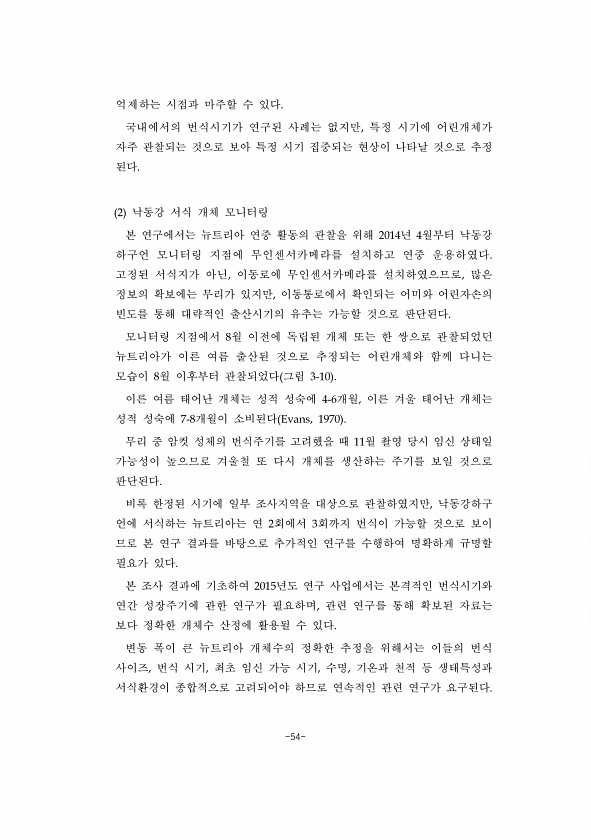 -54- 억제하는 시점과 마주할 수 있다. 국내에서의 번식시기가 연구된 사례는 없지만, 특정 시기에 어린개체가 자주 관찰되는 것으로 보아 특정 시기 집중되는 현상이 나타날 것으로 추정 된다. 2 낙동강 서식 개체 모니터링 본 연구에서는 뉴트리아 연중 활동의 관찰을 위해 2014년 4월부터 낙동강 하구언 모니터링 지점에 무인센서카메라를 설치하고 연중 운용하였다. 고정된 서식지가 아닌, 이동로에 무인센서카메라를 설치하였으므로, 많은 정보의 확보에는 무리가 있지만, 이동통로에서 확인되는 어미와 어린자손의 빈도를 통해 대략적인 출산시기의 유추는 가능할 것으로 판단된다. 모니터링 지점에서 8월 이전에 독립된 개체 또는 한 쌍으로 관찰되었던 뉴트리아가 이른 여름 출산된 것으로 추정되는 어린개체와 함께 다니는 모습이 8...